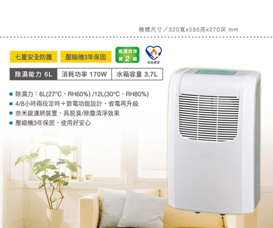 最大除濕能力一日6公升,奈米銀清淨濾網/脫臭/除塵清淨效果,節能第2級,省電又環保,除濕/脫臭/除塵清淨3效合一,生活品質大升級!